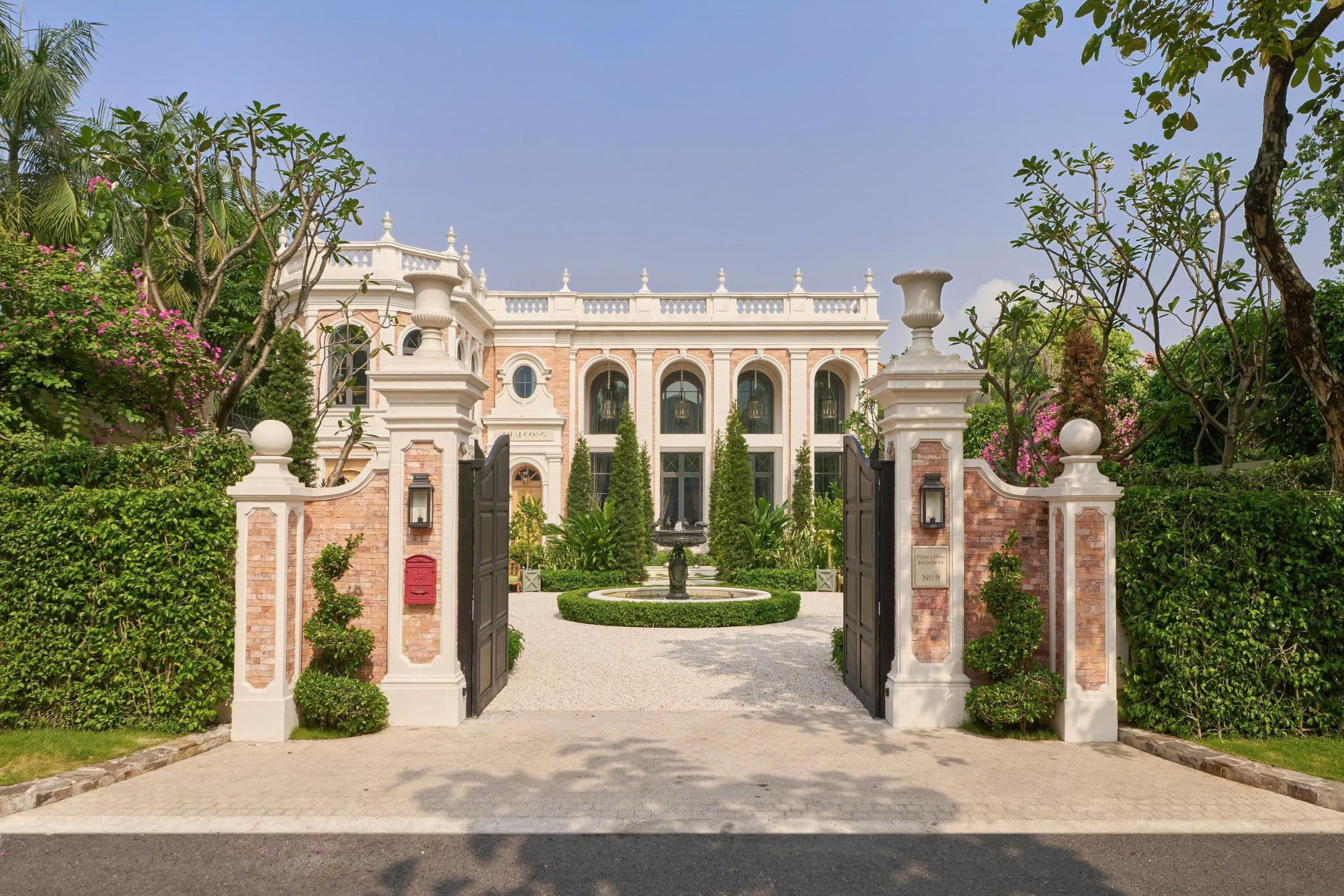 Khu vườn dinh thự The Thái Công Mansion được thiết kế đối xứng tạo nên không gian ngoại thất thanh lịch và chuẩn mực.