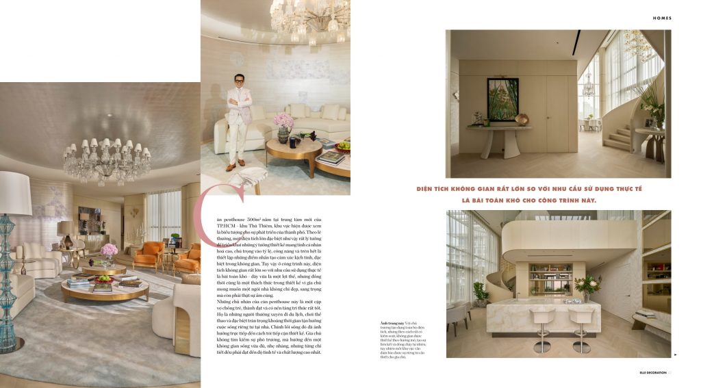 Căn penthouse 500m² nằm tại trung tâm mới của TP.HCM khu Thủ Thiêm, khu vực hiện được xem là biểu tượng cho sự phát triển của thành phố. Theo lẽ thường, một diện tích lớn đặc biệt như vậy rất lý tưởng để triển khai những ý tưởng thiết kế mang tính cá nhân hóa cao, chú trọng vào tỷ lệ, công năng và trên hết là thiết lập những điểm nhấn tạo cảm xúc kịch tính, đặc biệt trong không gian. Tuy vậy ở công trình này, diện tích không gian rất lớn so với nhu cầu sử dụng thực tế là bài toán khó – đây vừa là một lợi thế, nhưng đồng thời cũng là một thách thức trong thiết kế vì gia chủ mong muốn một ngôi nhà không chỉ đẹp, sang trọng mà còn phải thật sự ấm cúng.