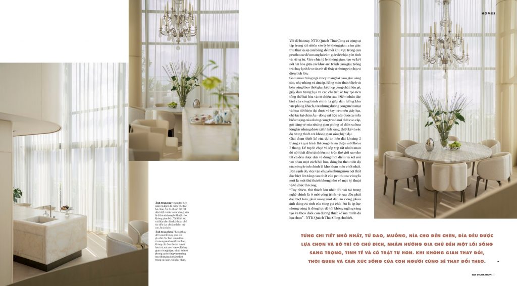 Với dự án này, NTK Quách Thái Công và cộng sự tập trung rất nhiều vào tỷ lệ không gian, cảm giác thư thái và sự cân bằng, để mỗi khu vực trong căn penthouse đều mang lại cảm giác dễ chịu, yên tĩnh và riêng tư. Việc chia tỷ lệ không gian, tạo sự kết nối hài hòa giữa các khu vực, tránh cảm giác trống trải hay lạnh lẽo vốn rất dễ thấy ở những căn hộ có diện tích lớn.